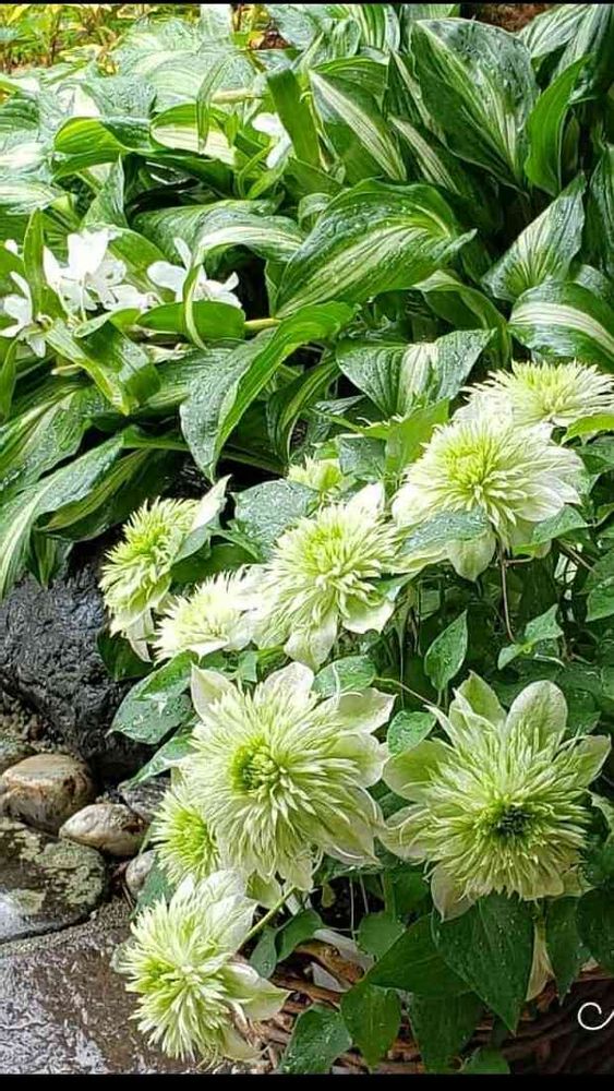 グリーン掛かった八重咲きの美しいクレマチスです