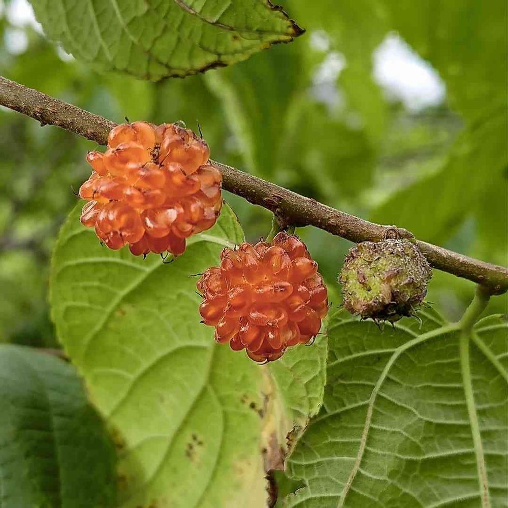 クワ科コウゾ属の落葉低木。山地の林縁に生える。枝は細くよく分枝する。葉はクワ科の他種と同じで変異が大きく、不分裂、2裂、3裂、5裂とバリエーション豊か。花期は4~5月。雌雄同株。新しく伸びた枝の先に雌花、根元に雄花がつく。雌花序は赤い雌しべを放射状に広げる。雌花は不稔のものもつく。果実は痩果が集まった集合果。球形で径1~1.5㎝。初夏に橙色に熟し、ねばついて口当たりがよくないが、甘くておいしい。