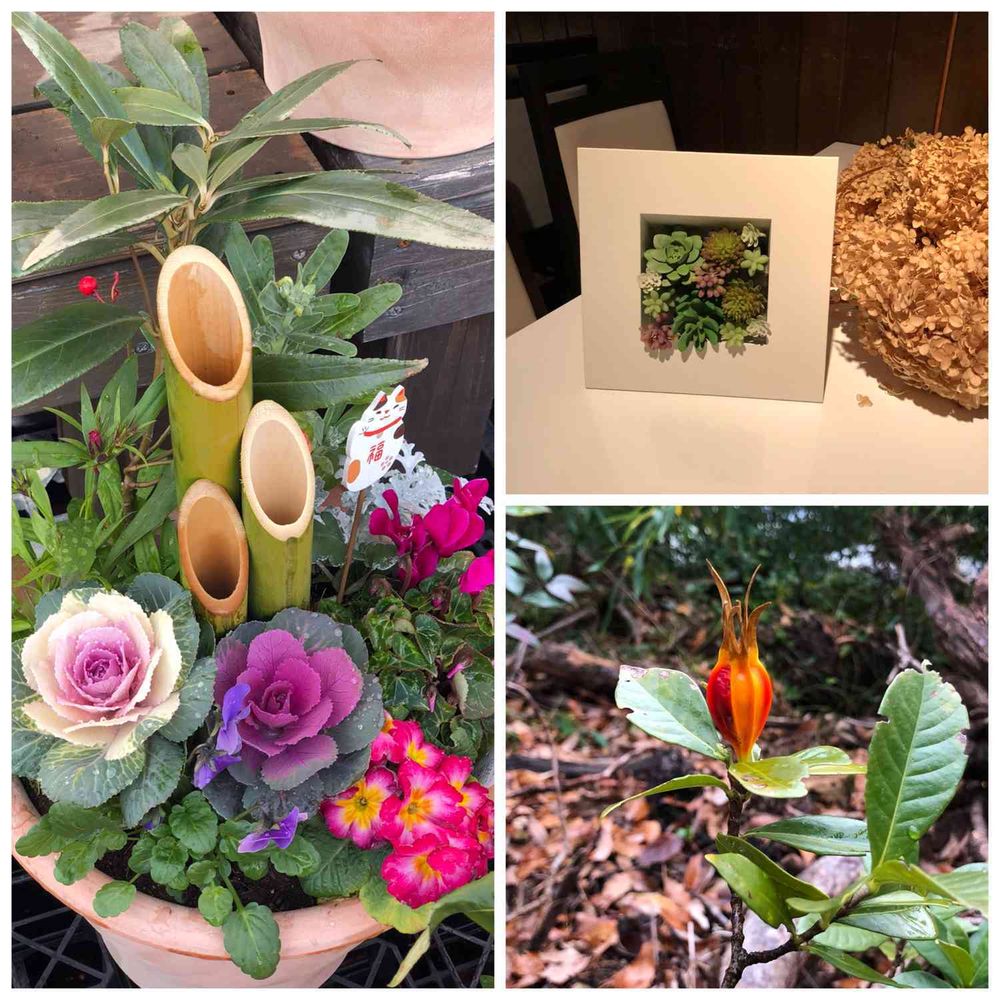 GS参加の皆さん昨年は素晴らしい傑作作品魅せていただきありがとう。本年もよろしくお付き合いください。私の新年挨拶代わりは時計回りの新春三景です。1.いつも行っている花屋さんの寄せ植え(失礼してパチリと拝借)。2.毎週プレーしているテニス同好会忘年会でお借りしたレストランにあった多肉ちゃん額など(残念ながらオーナーのアートフィシアル作品)。裏山の自生でも誰かが植えたか知れない木の実。いつもながら何の木か教えていただければ幸いです。