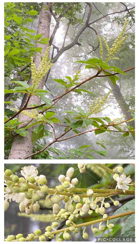 枝先から長さ10〜20cmの総状花序を数個だし、白い小さな花を多数つける。