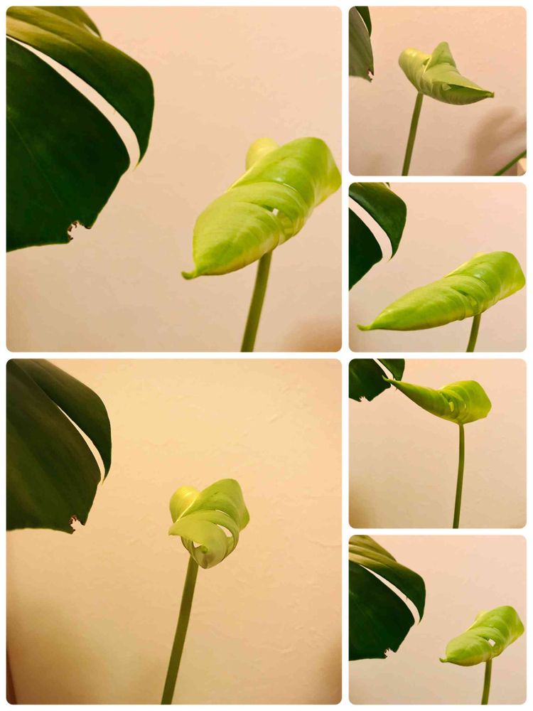 モンステラ新芽が開いてきたので、色々な角度から。しだいに、何かの顔っぽく見えてきて、面白くなってきてしまいました😊