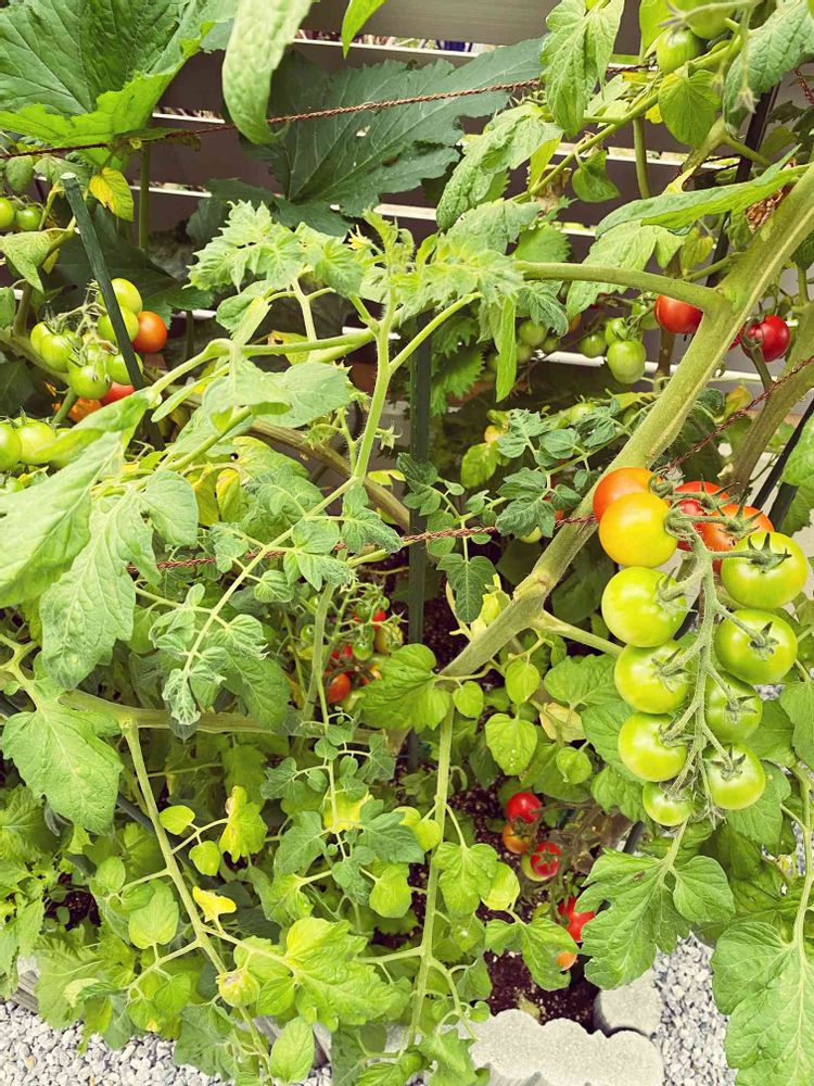 南向きでもないのにほんとによく成ってくれてます🍅『デルモンテの濃いあま』っ品種で、去年も育てたけど、液肥あげた今年の方が収穫出来て、背丈も大きく成長しています😍