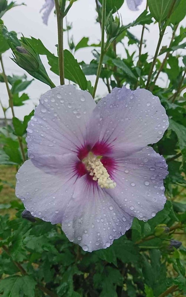 雨上がりで、素敵なムクゲ明日には、萎んでしまいますが、きれいな花色ですね。