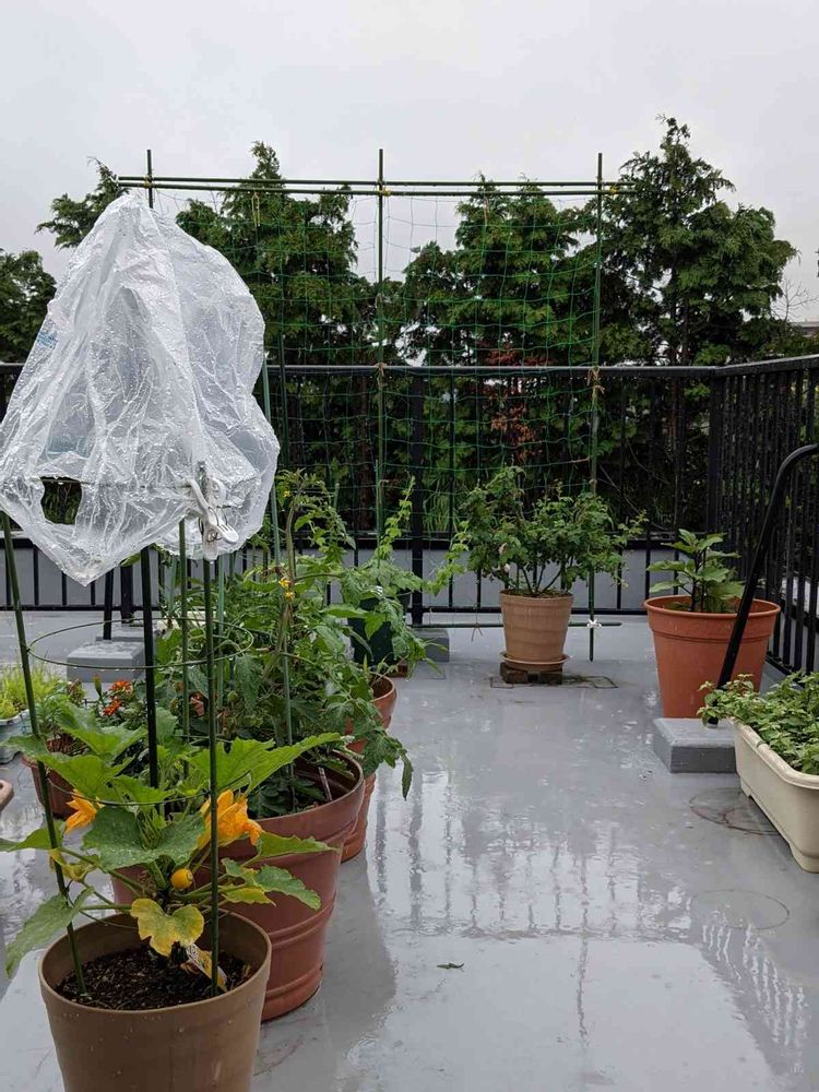 あまりにも雨☔すぎて、ズッキーニの花粉が流れて受粉出来なくて、明日も雨だしどうにかしたいけど、簡単な雨よけ方法はないかな?🤔
