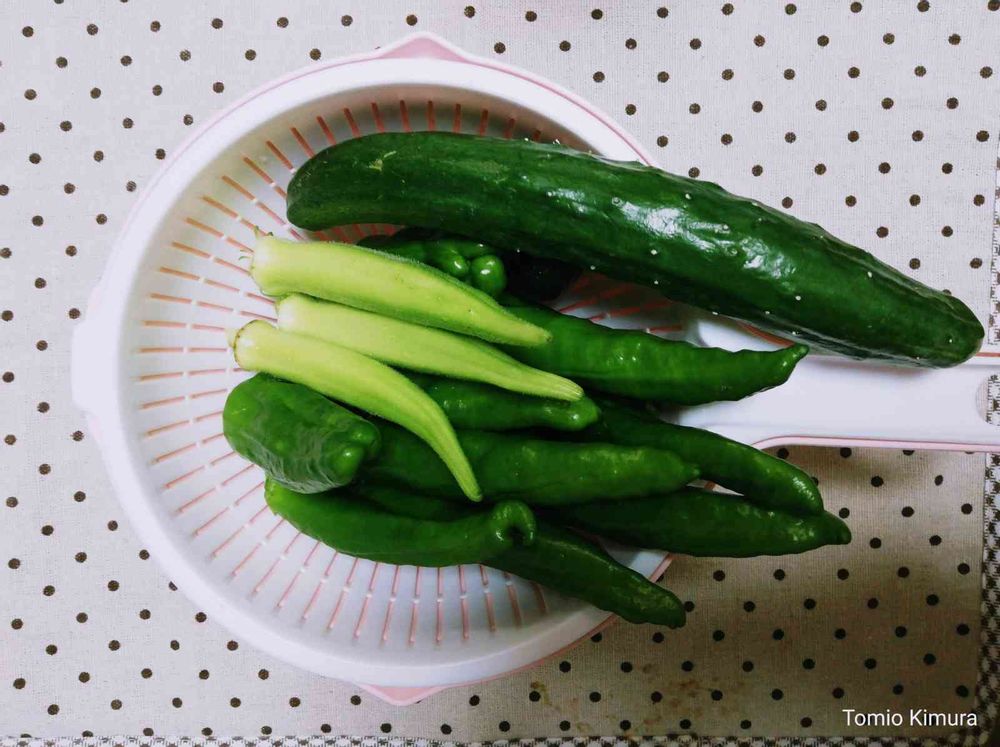 キューリ、ピーマン、万願寺とうがらし、白オクラ(真中の白っぽいもの)などでした。