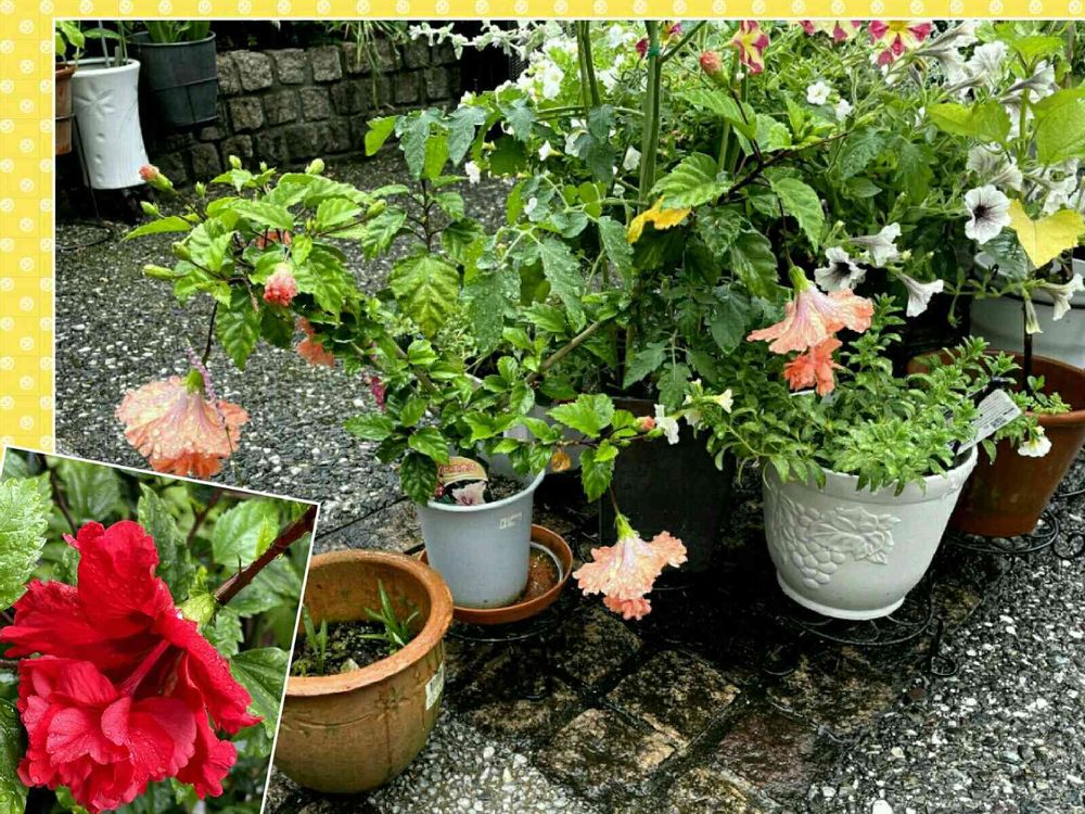 ハイビスカスが今朝はオレンジフラミンゴ3輪、レッドフラミンゴ1輪咲きました。