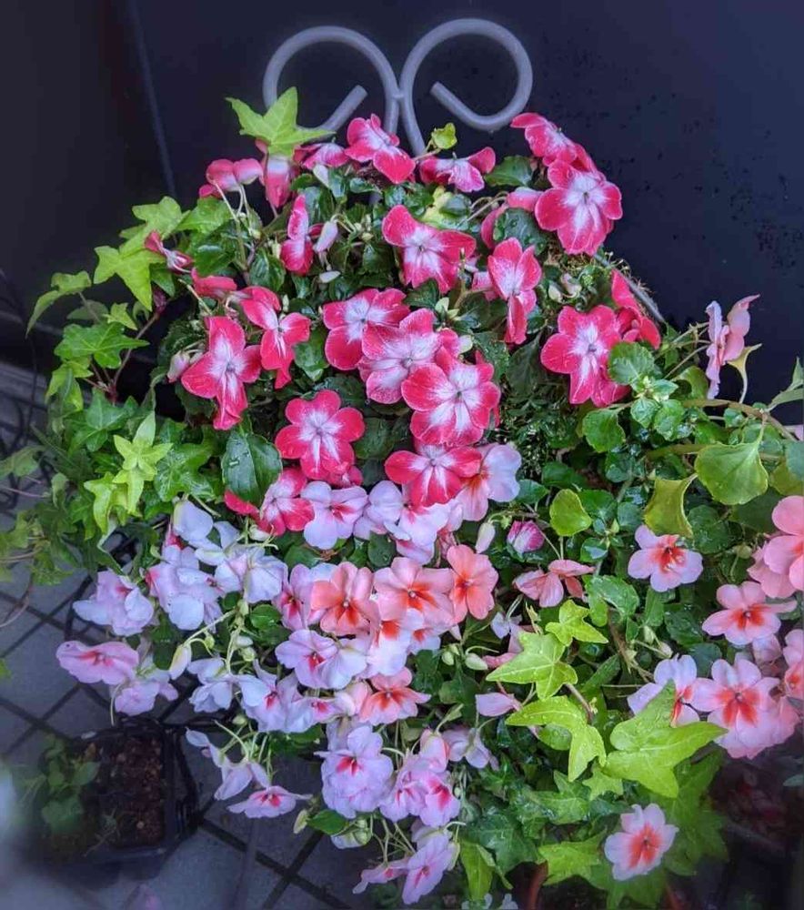 インパチェンスのリース寄せ植えがもりもりになりました。真ん中みえなくなってしまった!💦💦💦