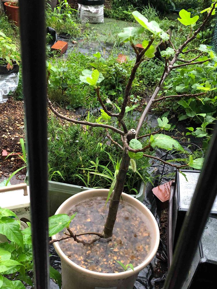 令和3年7月3日(土)雨☔️ 昨夜22時過ぎぐらいから雨音が強くなって大雨警報の知らせも幾度も届いています。picはイチヂクのドーフィン🪴いちど根詰まりで葉も実も無くさせてしまいましたがここまで復活🌱🌿雨が落ち着くまで待って避難させたい🥲