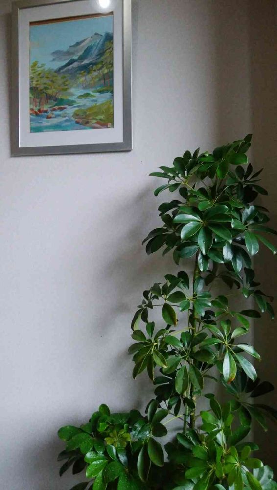立派なカポックですね。雨に洗われて深呼吸していることでしょう。私の家にも洗ってあげたいものがあります😊絵画が素敵です。ご主人様の絵ですか🖼