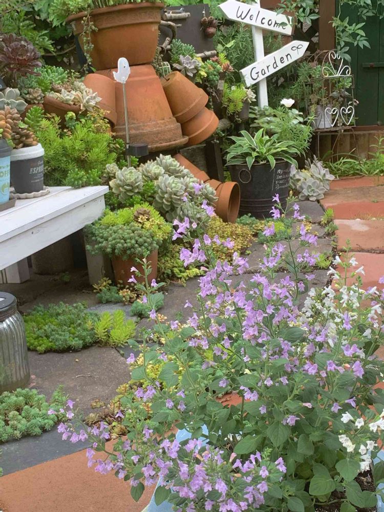 こう毎日ジメジメしてるとだんだん地面のセダムが苔に見えてきますが爽やか色のカラミンサを見て癒されてます💜🤍