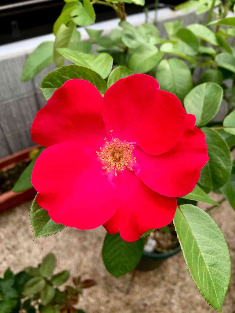 シンプルな一重の薔薇ですが、なんとも可愛い朱赤😍