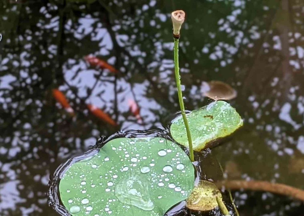 激しかった雨も今の所収まっています。お花の終わった手乗り蓮の上にも雨の名残り。赤い金魚に今日も元気をもらいましょう。