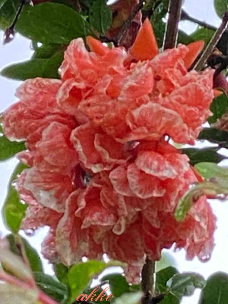 雨の中で咲いてる八重咲きの柘榴(ざくろ)でしょうか‼️