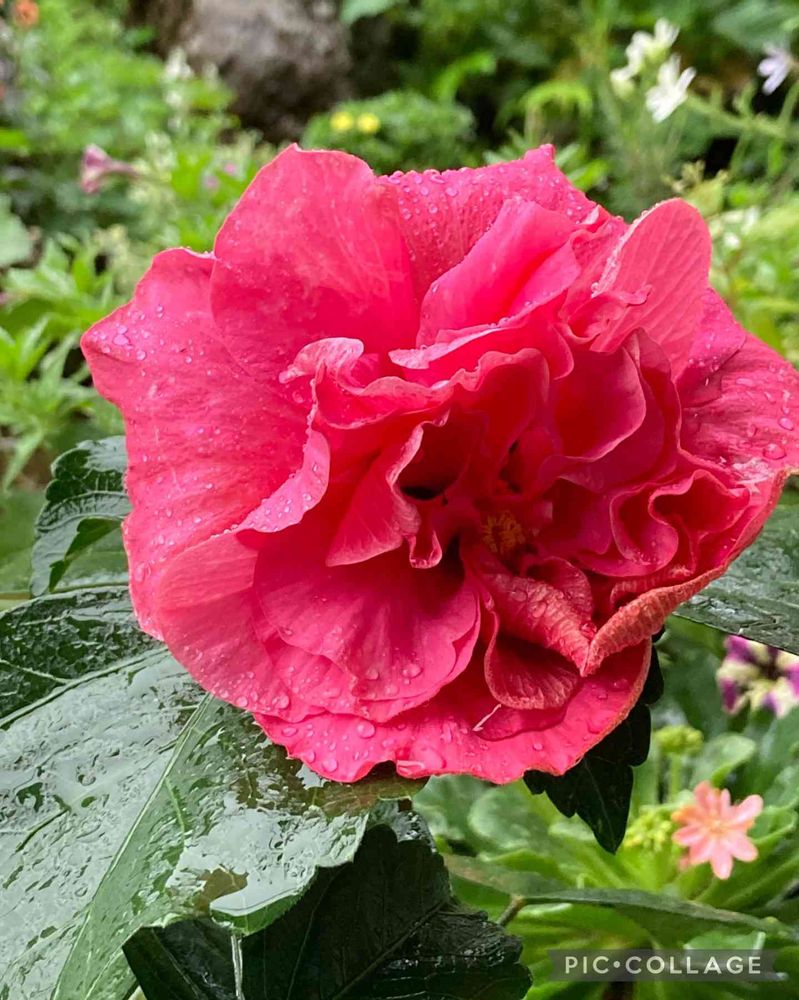 八重咲きのハイビスカスが雨の中、開花しました💕