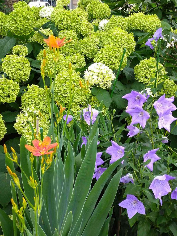 純白から、もう一度ライムグリーンへと変化してきた🌼アナベル🌼と💜キキョウ💜そして、咲き始めてきた🧡ヒオウギ🧡の競演です😍💖