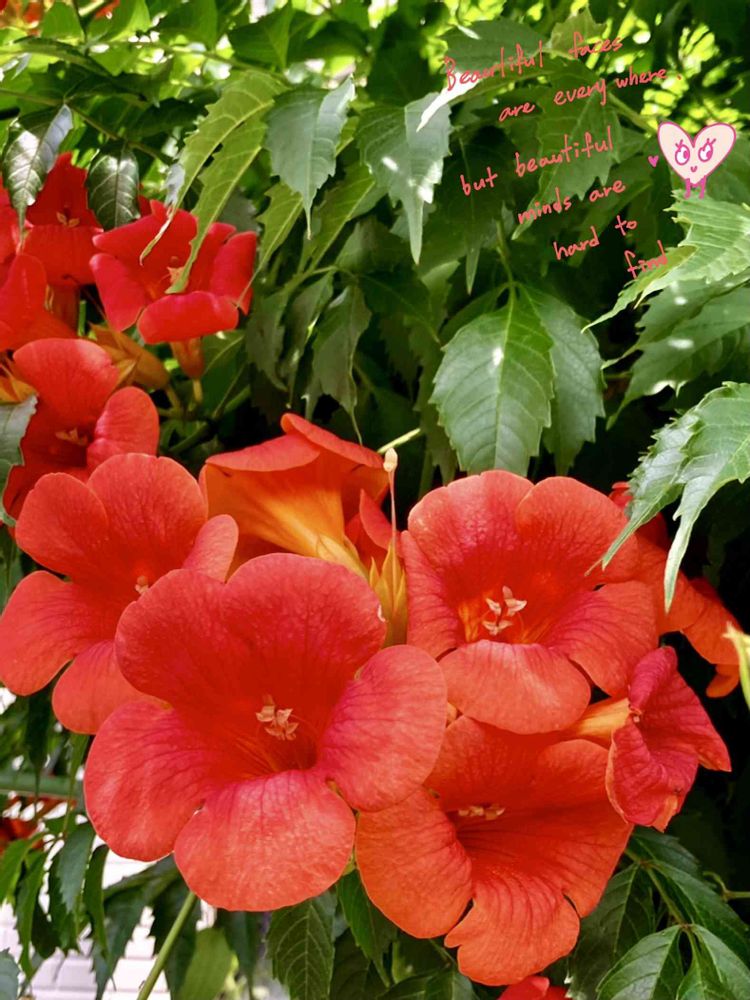 濃いめの❤️🧡が目立ちました、ノウゼンカズラ❣️ 我が家の道沿いにも咲いていますが淡いオレンジ色デス🥰