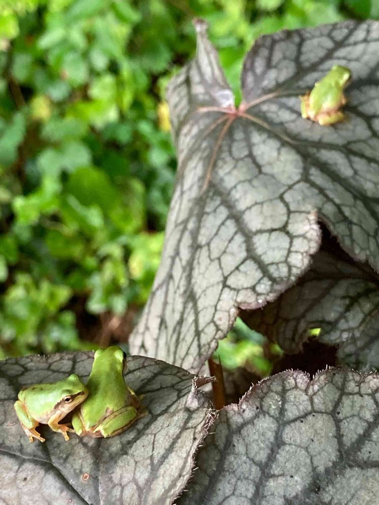 ヒューケラの葉っぱのサイズを考えるとミニミニ🐸さんですね。