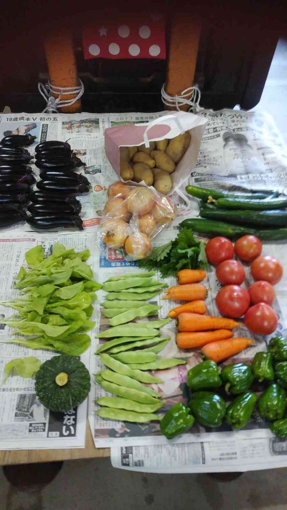 県外でひとり暮らしをしている孫へ今から箱詰めして送ります!タマネギ、じゃがいも、キュウリ、ナス、トマト、ニンジン、ピーマン、モロッコエンドウ、坊ちゃんカボチャ、大葉、サニーレタスの間引き……😊😊🐶