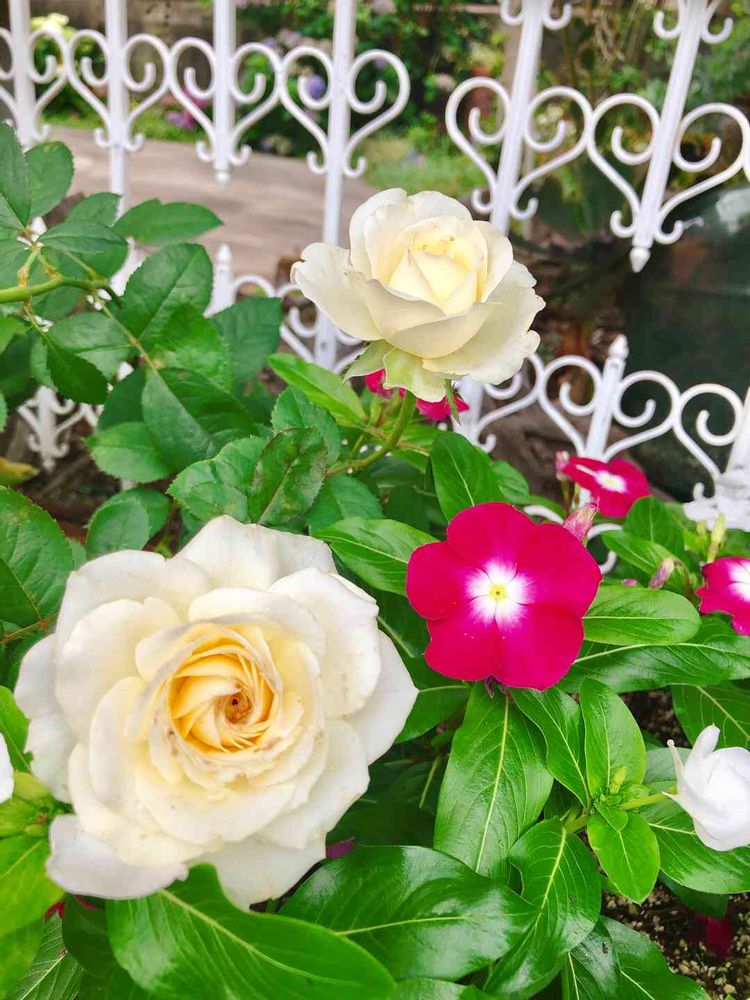 薔薇もニチニチソウも綺麗だし葉っぱもツヤツヤですね🤩
