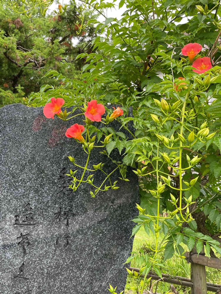 何回も御薬園に足を運んでるのに、おお!今日のお花ノウゼンカズラだ〜❗️と思って横を見ると句碑がありました。