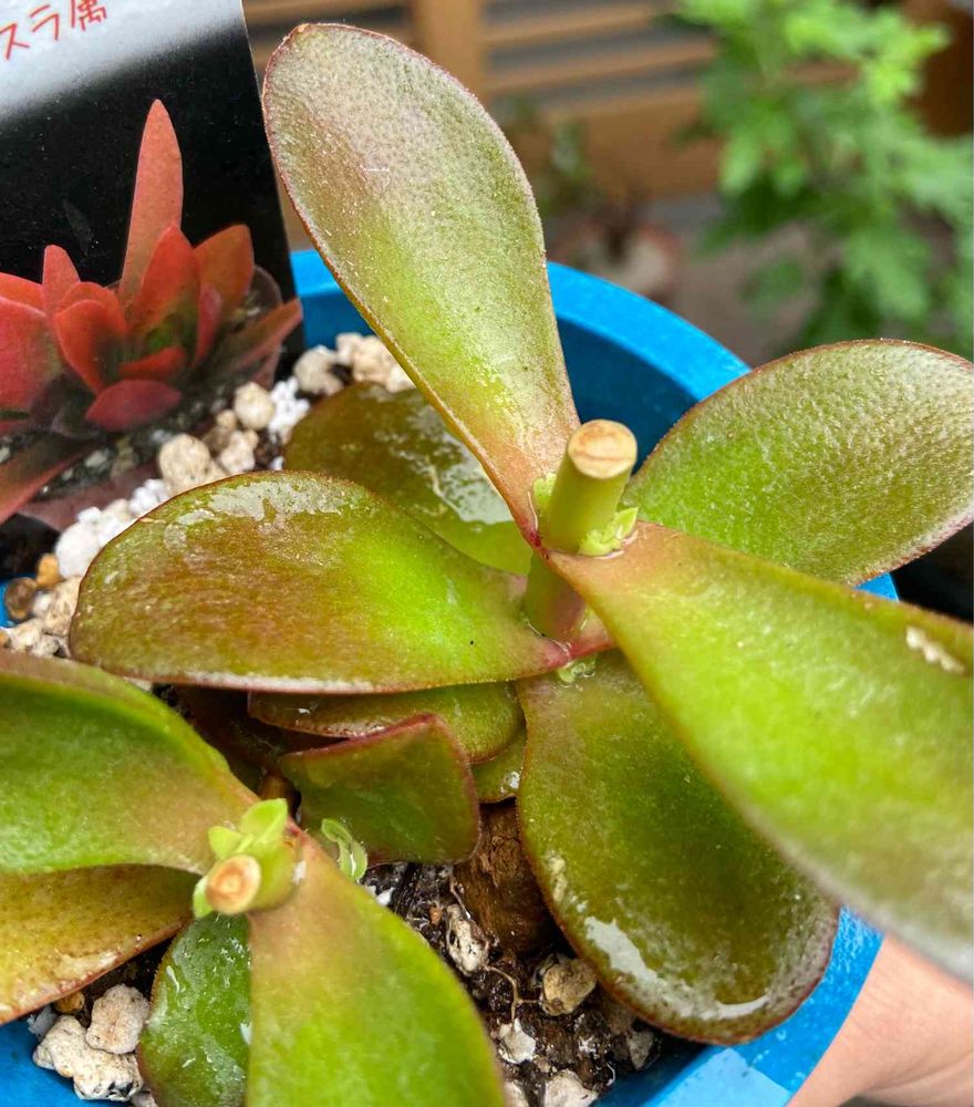葉っぱ濡れてるし色がすごいことになってるけど…火祭りがあまりに伸びてしまったので、2週間くらい前にちょんぱして、この後芽が出てくるのかな…まあ頭だけ無事ならいいか〜と思ってたら、10日くらいで脇芽がわんさか出てきて笑いが止まりません🤣