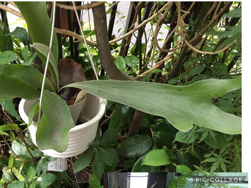 シダの日。ビカクシダ。最初より一回り大きくなり、陽射しが強い日が続いていた時にベランダから庭の海堂の木の下に移したら、成長が止まってしまいました。日当たりがいい方が良かったのかな?