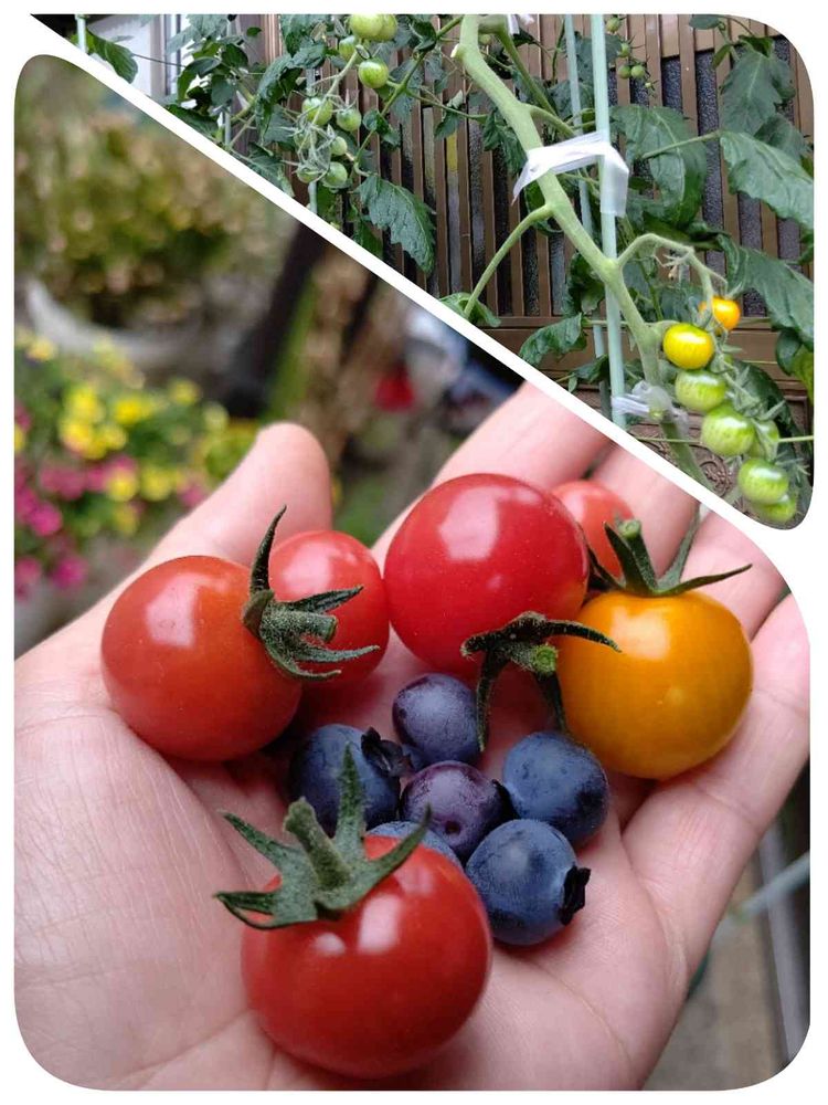玄関先で、鉢植え栽培しているミニトマト『ピンキー』と『きらーず』
