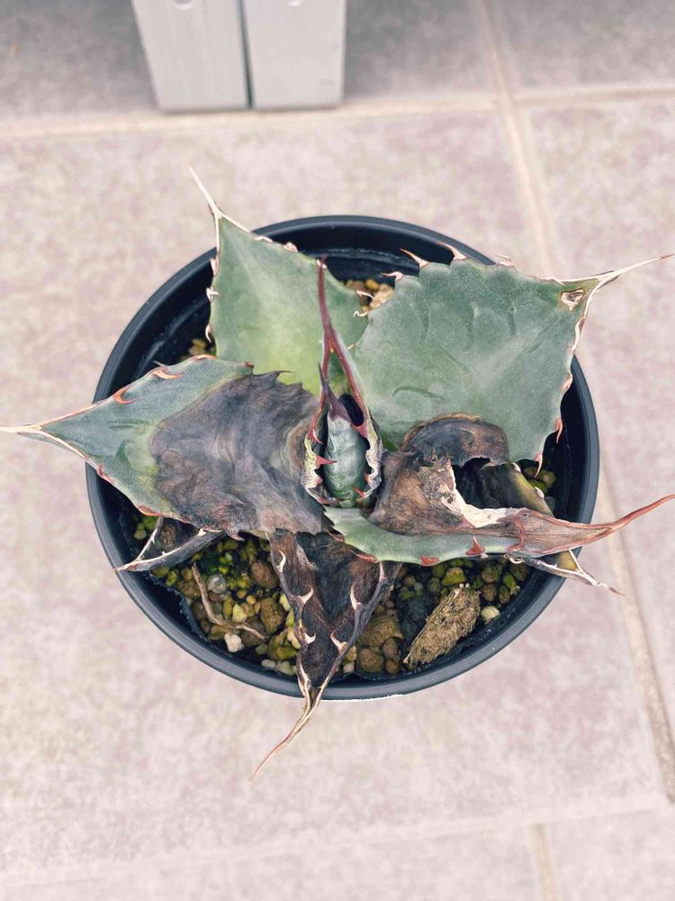 炭疽病のようですが中心部まで進行しているので助かるか微妙です。他のアガベも含めて殺菌剤を散布することをお勧めします😷