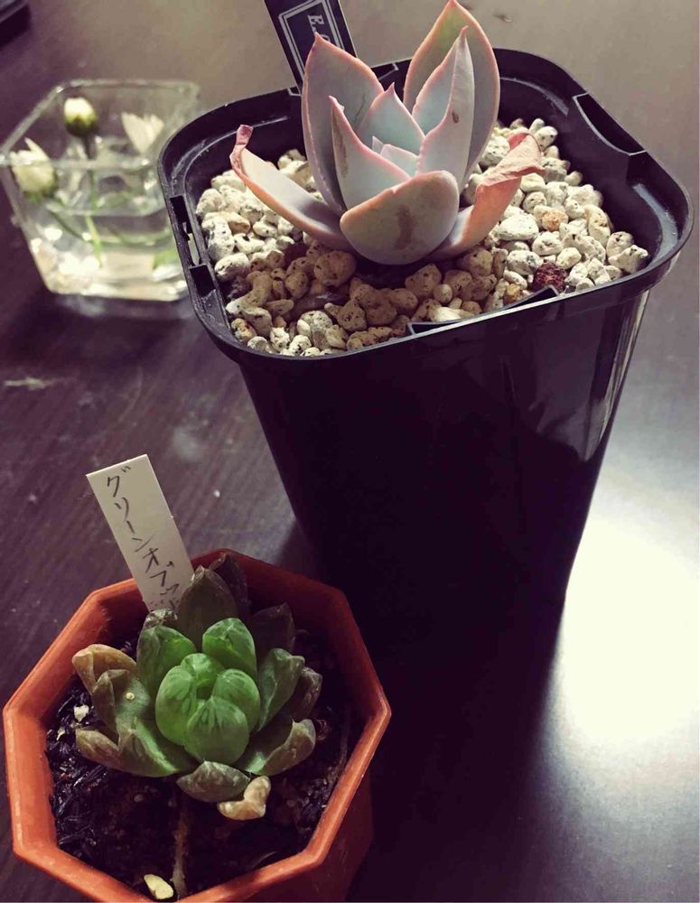 手前の子はグリーンオブツーサって書いてるけど、徒長したオブツーサに見える笑
