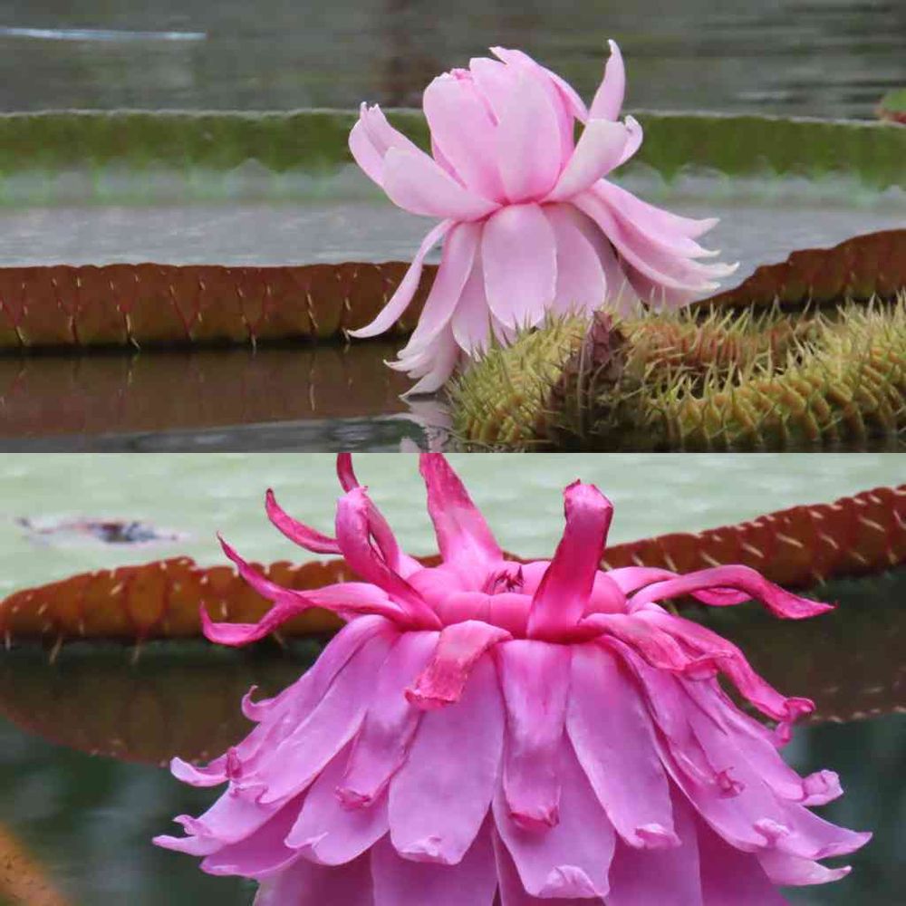 前回のバナナワニ(下)と今回の花鳥園(上)のオオオニバス🌸確かに今日のは雨降りが続いた後の開花🌸、バナナワニのは2、3日前は晴れて☀️咲いた日は曇り空!