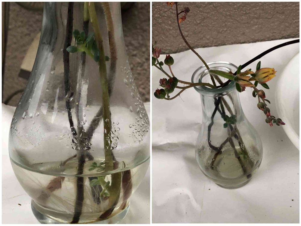 切り取った花芽を水が入った瓶に挿して放置してたら、芽が出ていた。