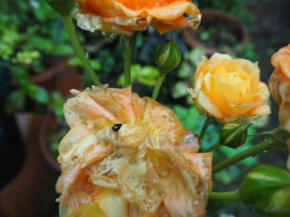 ん?手前のずんだれた薔薇にいるのは、GSの睡蓮師匠を苦しめるルリマルノミハムシなのでは…?