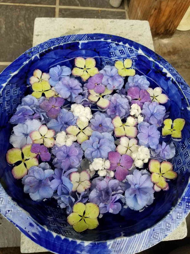 器の色と紫陽花の花色が、涼しさを届けてくれてますね。