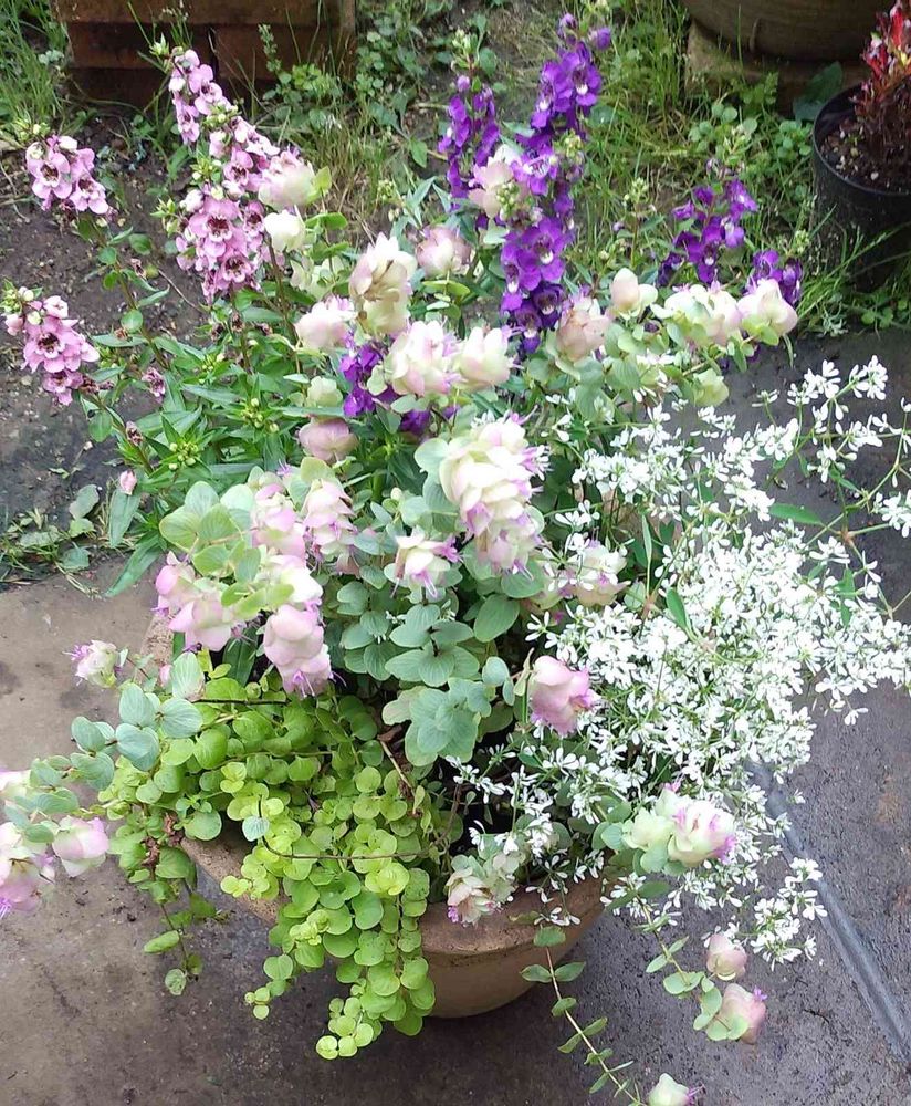 買い置きのアンゲロニアとユーフォルビアとの寄せ植えにしました。