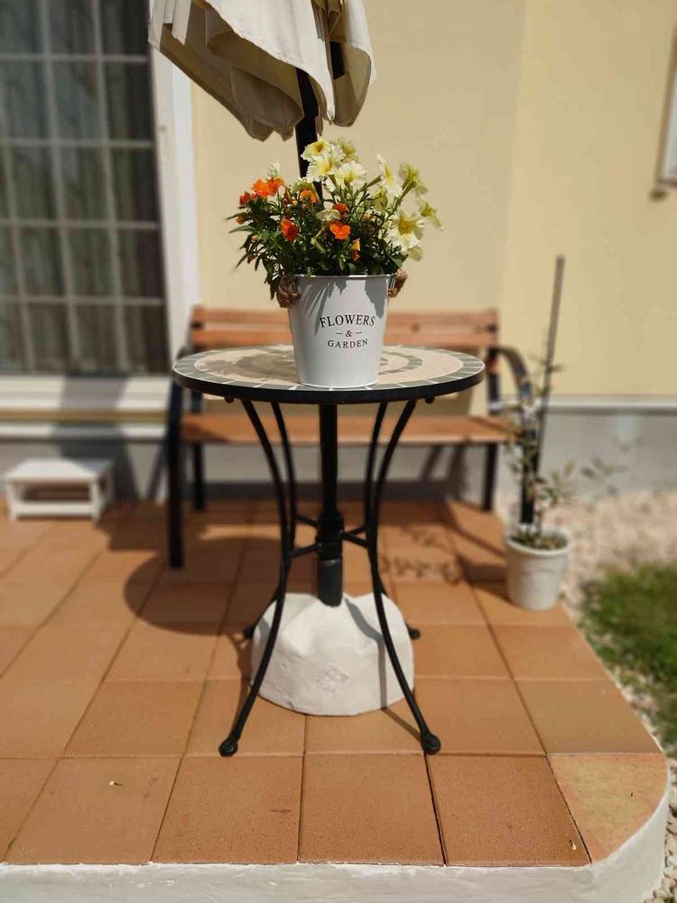 ガーデンテーブルに寄植えを設置したら華やかになってきました🌺