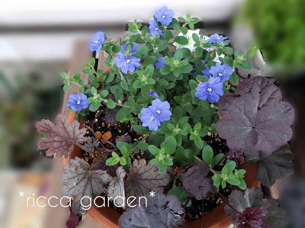 可愛い寄せ植え~💙ブルーが涼しげでヒューケラのカラーとマッチしていてとてもオシャレです💕