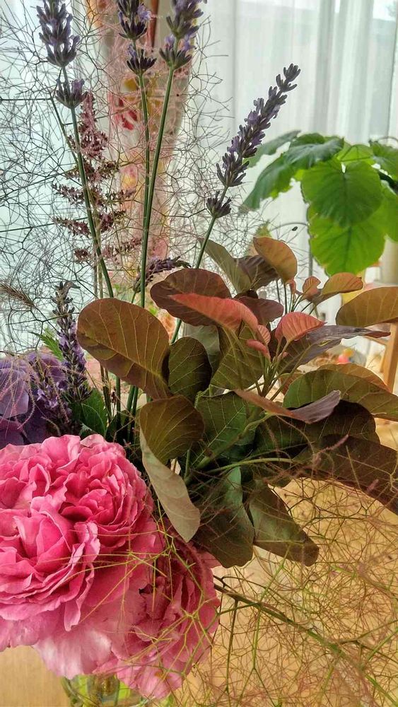 昨日の朝にチョッパー✁して紫陽花・バラインピアッチェ・イングリッシュラベンダー・モフモフのスモークツリー!ドバーと入れてパシャリ、出勤(笑)