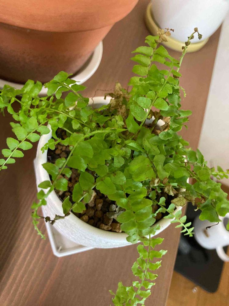 たぶん空中湿度が足りません、シダ類は、水よりも空中湿度を好みます、鉢に、霧吹きで水をあげて、ジップロックに入れて置くと湿度を高めます、ジップロックは風船のように膨らむようにしてください、
