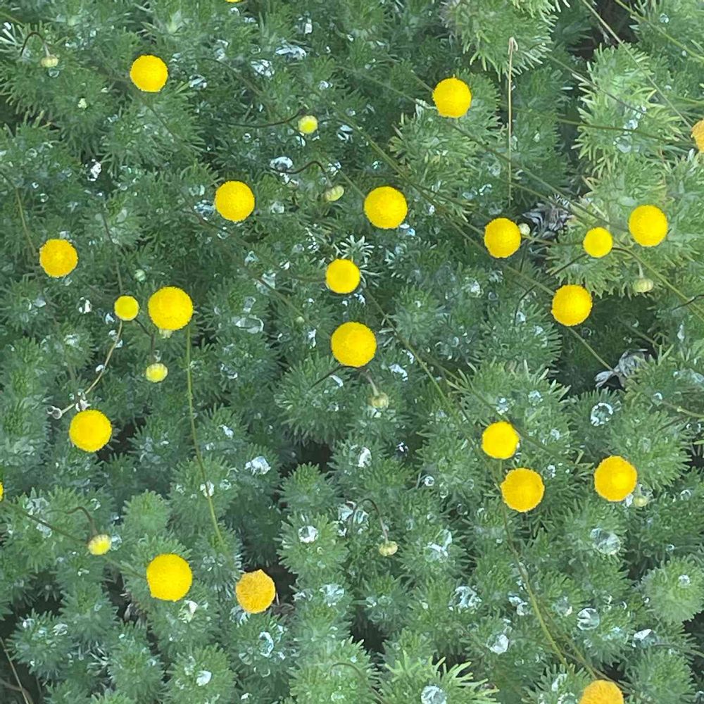雨上がりに小さな黄色いお花がゆらゆら。ふわふわした葉の上に水玉がころころ。