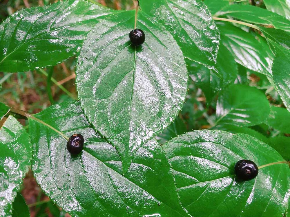 新治市民の森で見つけたハナイカダです。葉っぱの真ん中に実をつけるのが、独特ですよね。