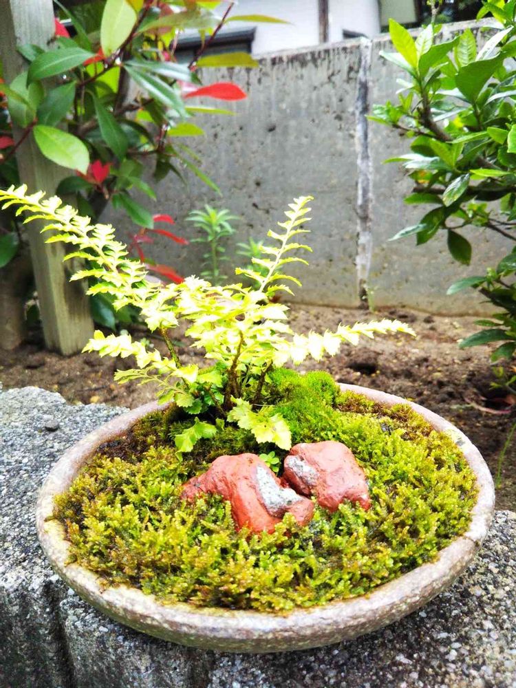 おはようございます。三年前ブロックの間に出てきたシダと、自称本家の親父が、仕事の合間に清流で拾った赤石を昨年もらい、苔は自宅駐車場から採取して、丸型平鉢に寄せ植えしました。今年になり、鉢に石もシダに苔も馴染んできたように🙇👴思ってます🙂自画自賛です🤩