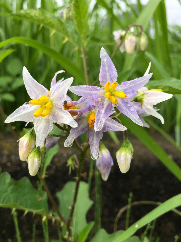 帰化外来種のワルナスビが利根川堤に茄子のような綺麗な花を