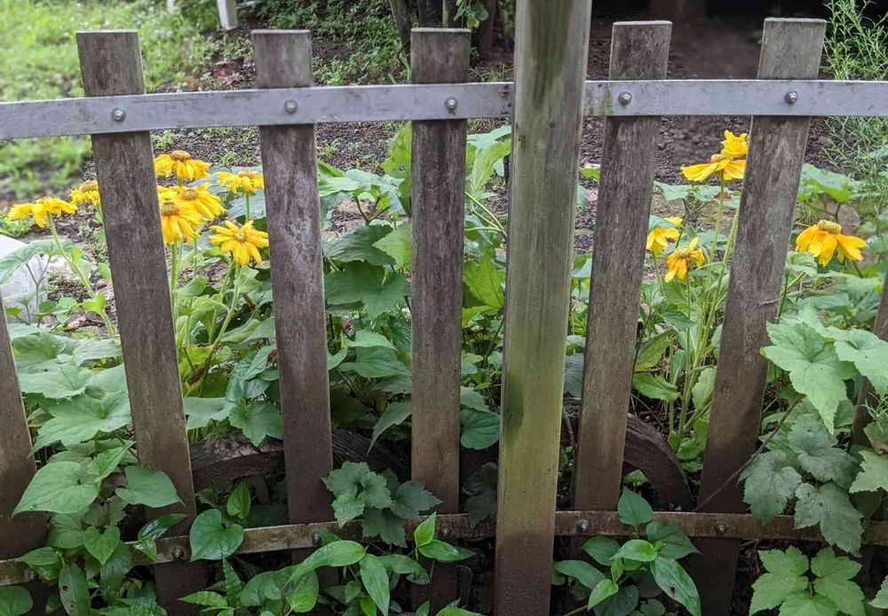 小さいドッグラン周りに先日植えた黄色のルドベキア。八重の秋明菊の旺盛な葉の中でもちゃんと主張してくれています。優しげなお花だけで無く、こんなお花も元気をくれていいものです。趣向を変えて今日はドッグランの内側から写してみました。