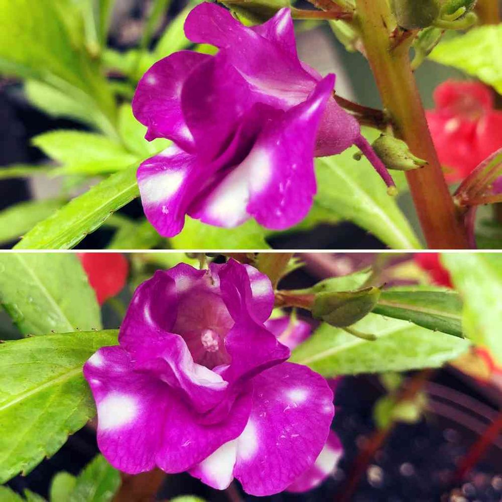 白い斑模様がある紫のホウセンカ咲きました✩.*˚空は生憎の雨降りです。