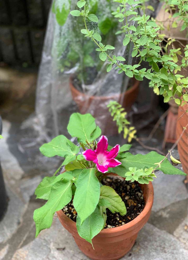お隣から頂いた蔓なし朝顔、、梅雨の真っ只中、花が咲きだして😊これから次々と花が咲いてくれるといいな💕
