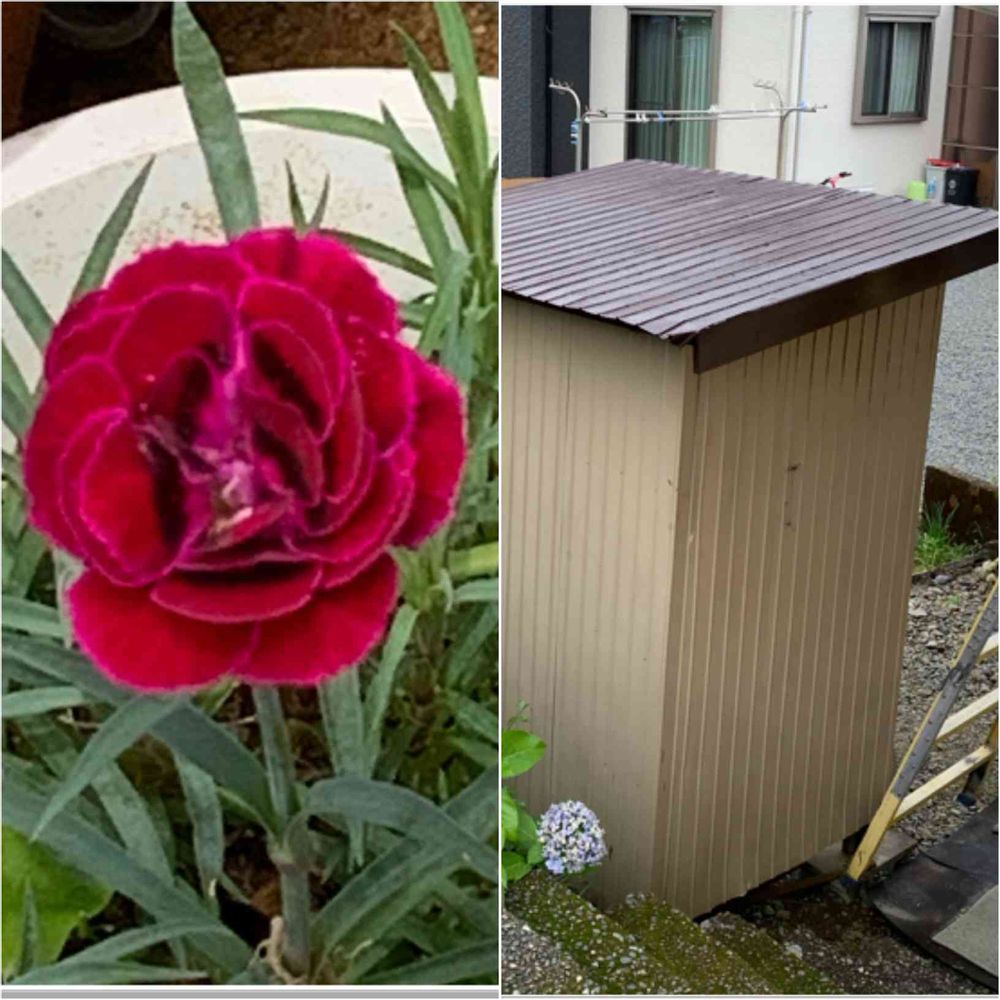 右の小さな物置ですが、足場が悪くて脚立を近づければ近づけるほど屋根から遠のくと言って、( ̄艸 ̄)