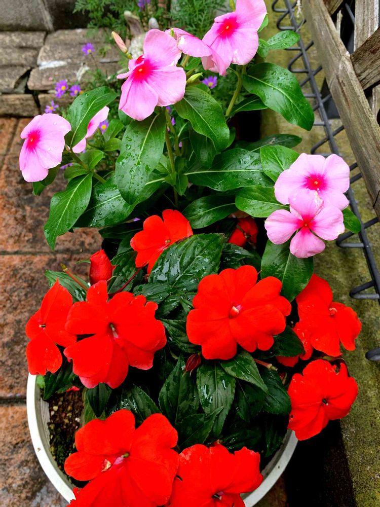 暖色系のお花➖ニューギニアインパチェンスの朱赤と、日々草のピンク色〜🎶💖😊