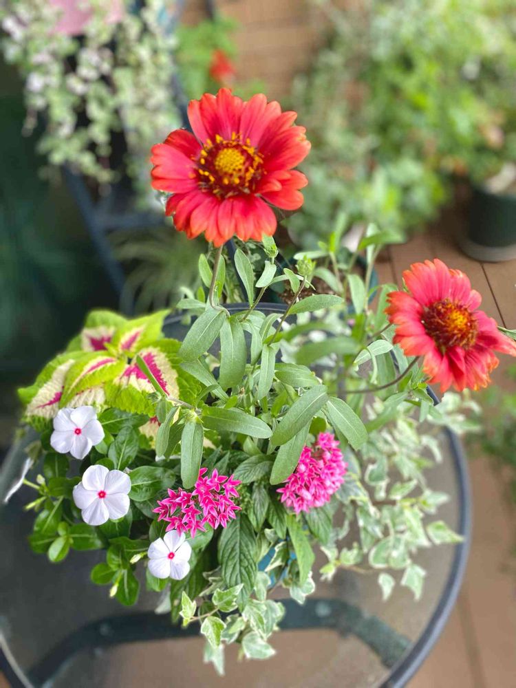 ガイラルディア途切れることなく咲き続け、ペンタスも開き、ビンカも次々咲いています。コリウスも伸びてきました。