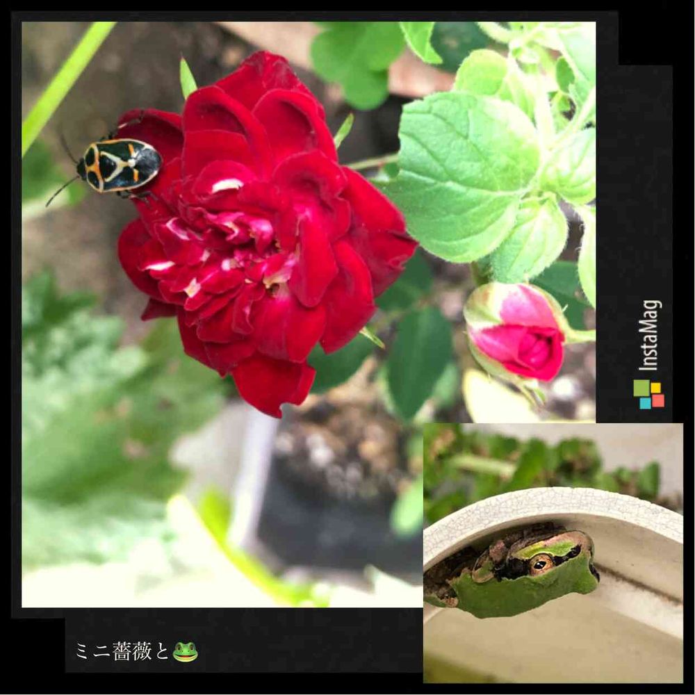 真っ赤な薔薇✨🌹✨さんに珍客登場❤️🐸 カエルくん可愛いね✨カメムシくんは…ずいぶんとハイカラさんだわ(*`艸´)クククッ