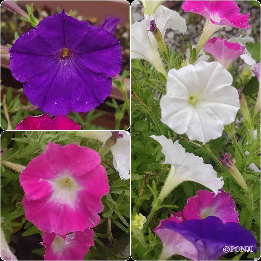 プランターに植えてあるペチュニアさんの3色です💜🌱🤍🌱❤️